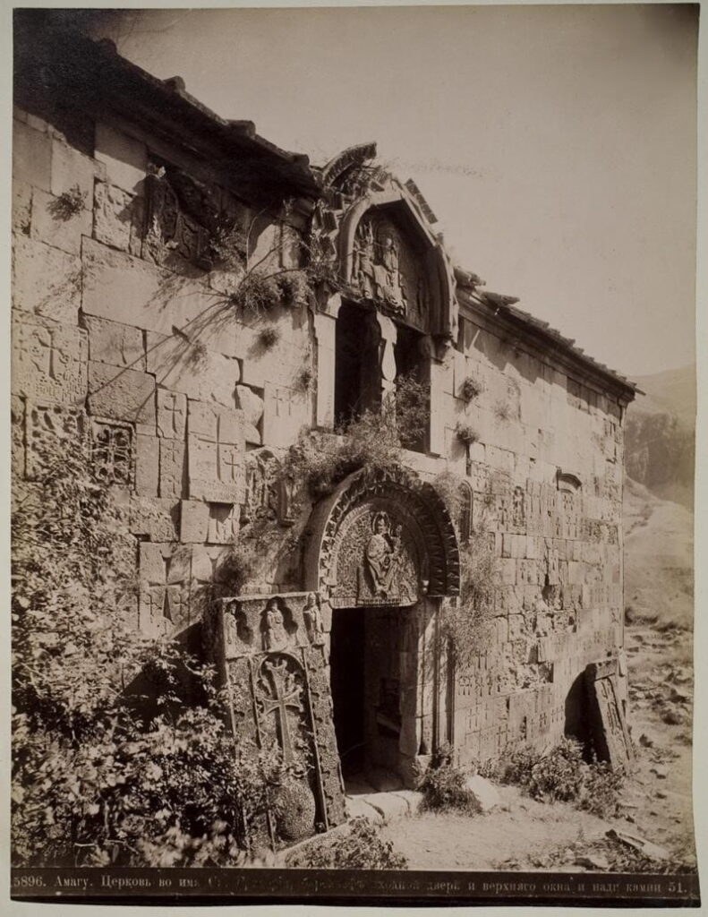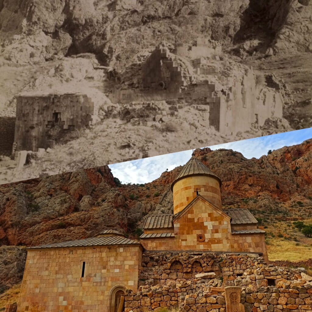 However, the wheel of history was ruthless towards this architectural marvel. Over the centuries, devastating earthquakes and endless invasions by enemy hordes inflicted deep wounds on the monastery. The scale of the historical devastation becomes most evident when we examine the archival shots taken by the famous Russian photographer Dmitry Ermakov in the 1890s. In those photographs, Noravank appears in a ruined and dilapidated state: collapsed domes, scattered fragments all around, and greatness buried under the cruel dust of time.